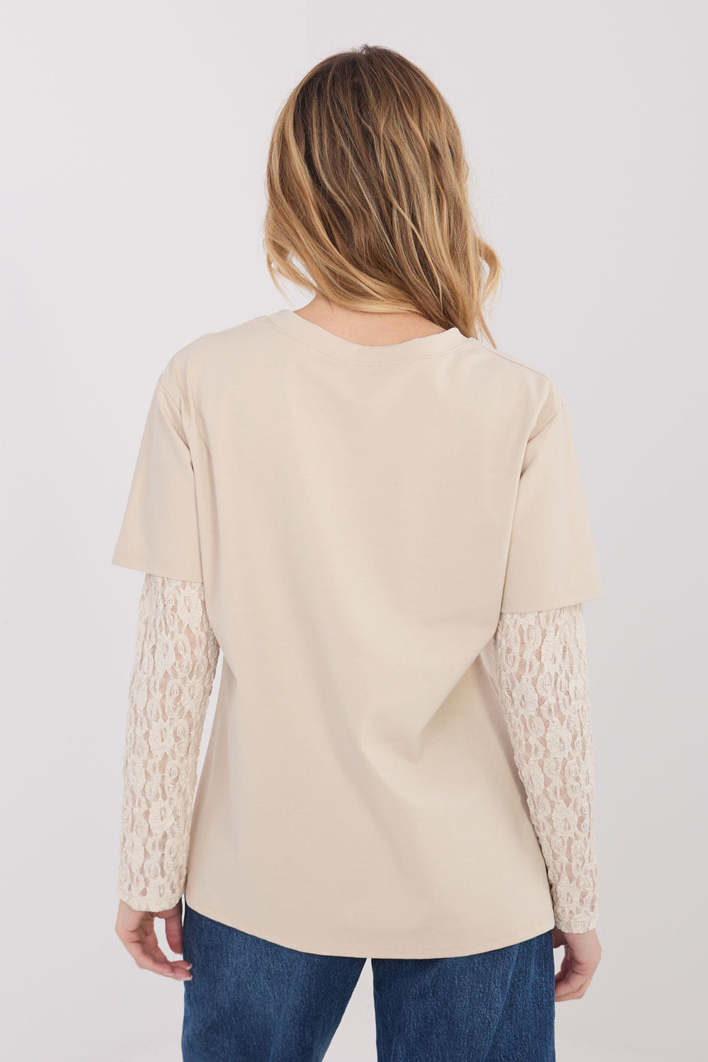 The daily women’s blouse with a casual character combines simplicity with a delicate, feminine accent. Made of high-quality blend of cotton, nylon, and elastane, it is pleasant to the touch, breathable, and flexible, ensuring comfort throughout the day. The smooth material emphasizes the blouse’s universal style, making it perfect for everyday stylizations. The model has a standard length and a round neckline, which adds classic elegance. The 3/4 sleeves made of delicate lace introduce a subtle, eye-catching detail, distinguishing the blouse from classic options. It is an ideal choice for women who appreciate comfort combined with a feminine finish.