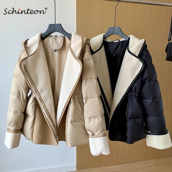 Color: Khaki – Size: S – Schinteon Women Lambswool White Duck Down Jacket with Hood Autumn Winter Warm Outwear Casual Patchwork Coat European Style 251011