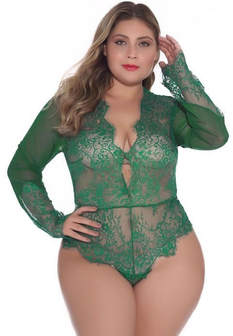 You’ll look like a lacy luxury when you adorn this plus size floral lace long sleeve teddy featuring a deep V-neckline with scalloped trim, a sheer bodice, and a cheeky cut with an eyelash lace hem.
